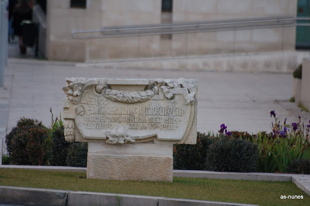 Placa evocativa do Centenário de Alexandre Herculano, recentemente colocada na rotunda do Sinaleiro, na fronteira com o largo da fonte luminosa (parte integrante da Praça Goa, Damão e Diu), no local onde se situava o Teatro D. Maria Pia, barbaramente demolido à força, em 1959.