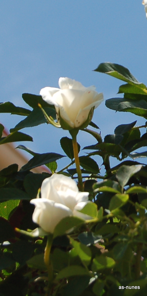 Estou a lembrar-me particularmente de ti, e a antever umas das rosas mais lindas do meu jardim, aquela que vou fotografar e que a vou mostrar aqui, uma rosa branca, em fundo azul celeste, como a cor dos teus olhos.