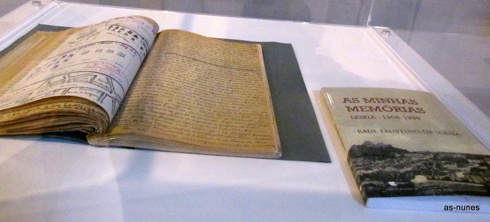 O livro e o manuscrito que lhe serviu de suporte, dentro duma vitrina. Em exposição no m|i|mo, em Leiria.