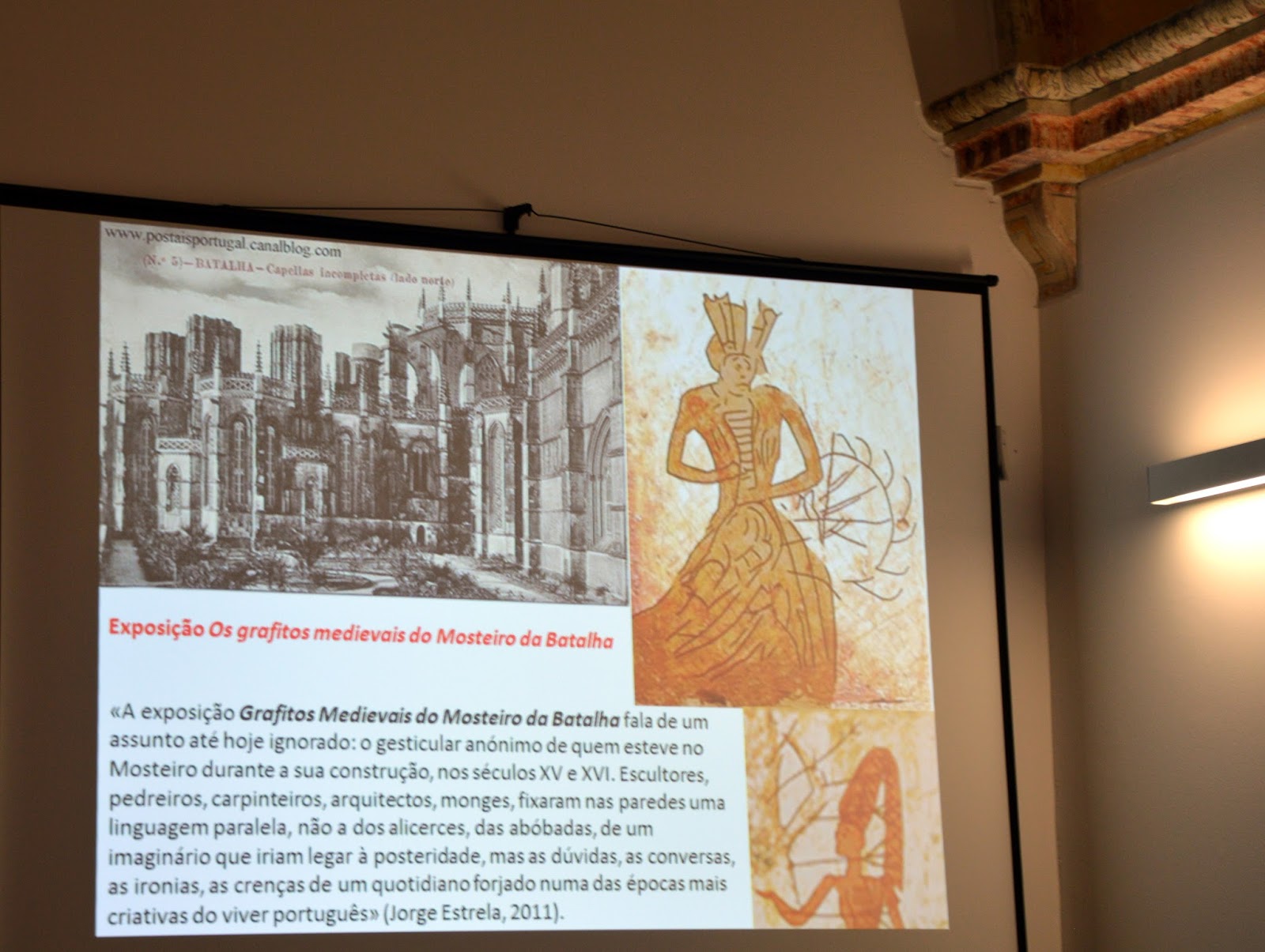3) A dado passo da sua intervenção, o Prof. Dr. Vítor Serrão falou dos Grafitos Medievais do mosteiro de Alcobaça, descobertos e primorosamente descritos por Jorge Estrela: